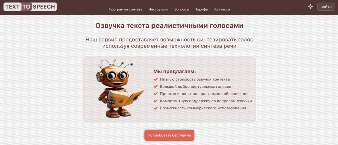 Специализированный сервис синтеза речи, который превращает текст в реалистичную озвучку для коммерческих и личных проектов. Им пользуются рекламные агентства, торговые сети, транспортные компании, образовательные проекты и блогеры, когда нужно быстро получить дикторскую дорожку без записи в студии. Нейросеть озвучка текста обрабатывает сценарии, объявления, автоинформаторы, инструкции, аудиоролики для соцсетей и даже голосовые сообщения для роботов-пылесосов. Интерфейс рассчитан на неподготовленных пользователей: вставил текст, настроил параметры, нажал «преобразовать в речь» и скачал файл в нужном формате.