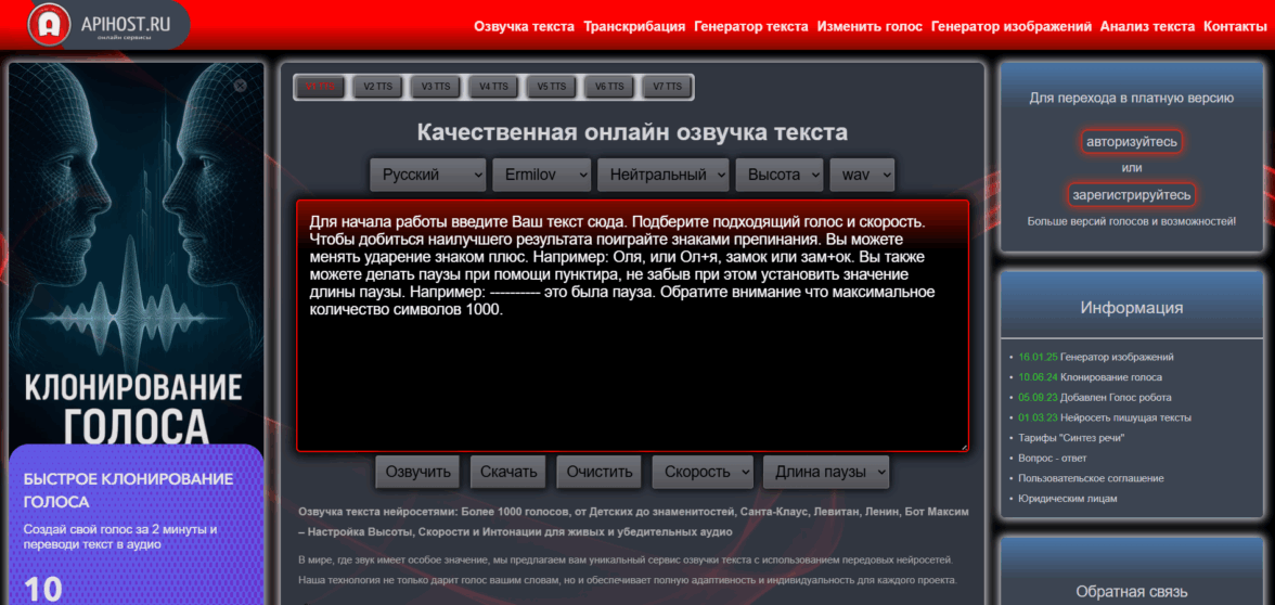 Apihost — обеспечивает высококачественную озвучку с регулировкой скорости, пауз, тембра и возможностью генерации голосов для роликов.