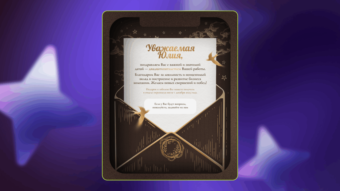 ГИФ-открытки создавались индивидуально для каждого специалиста. Важно было передать ощущение персональной благодарности от лица компании — как если бы награду вручали лично. Такой подход помог продолжить идею того, что каждый сотрудник является важной частью семьи и его вклад имеет значение.