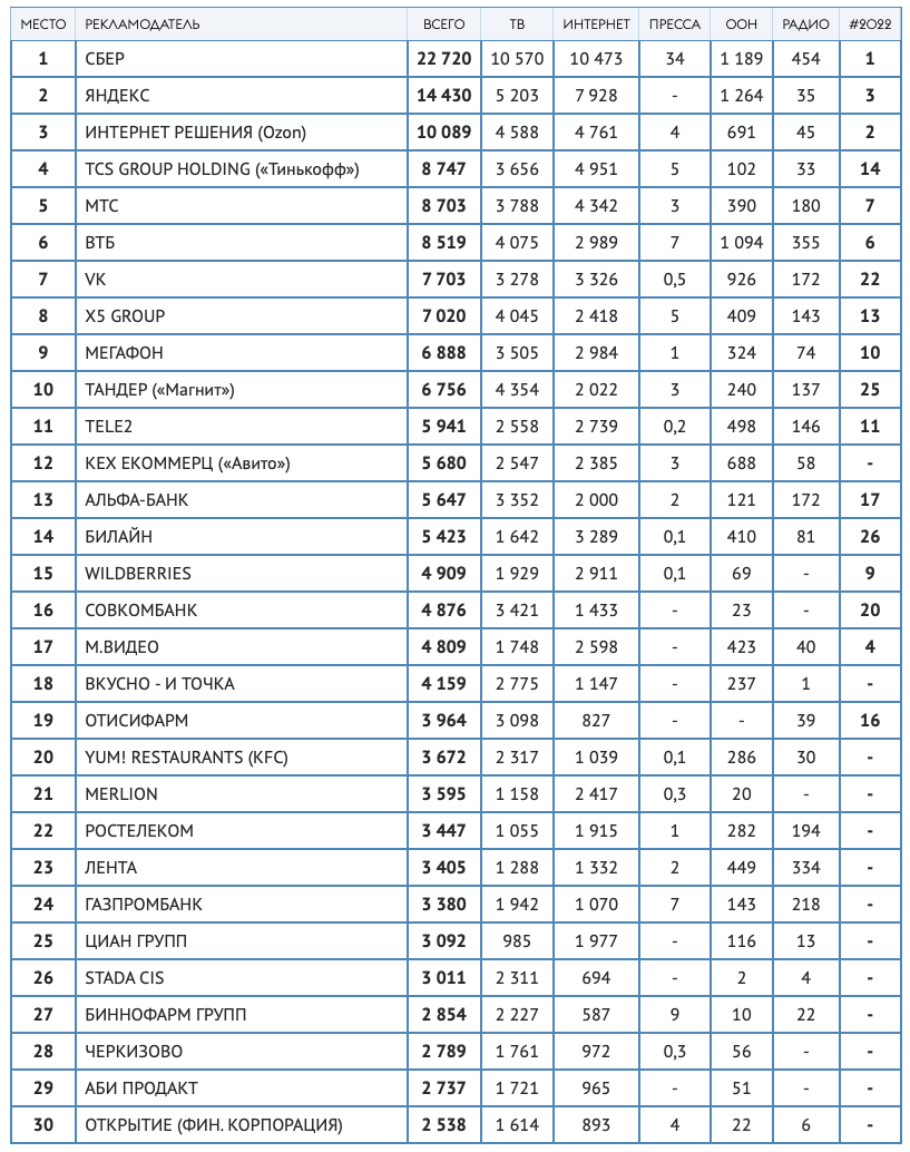 Подсчитанные затраты на рекламу большинства рекламодателей из топ-30 возросли. По данным Sostav, в 2022 году расходы на рекламу компаний из топ-30 составили 181,5 млрд рублей без налога на добавленную стоимость (НДС). Это на 17% больше, чем в 2021 году (154,2 млрд рублей).