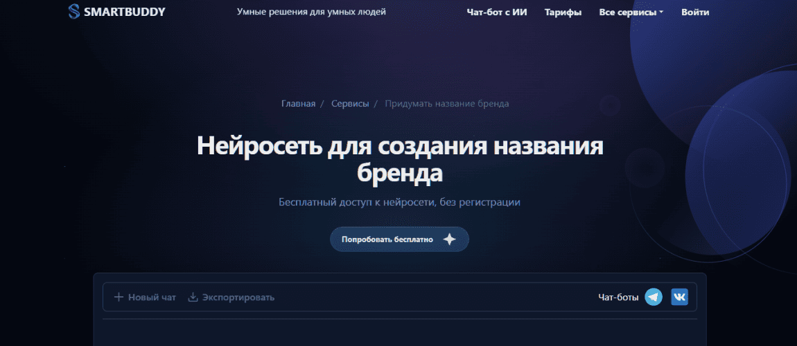 SmartBuddy — предлагает бесплатный доступ к топовым нейросетям без регистрации для генерации оригинальных названий брендов.