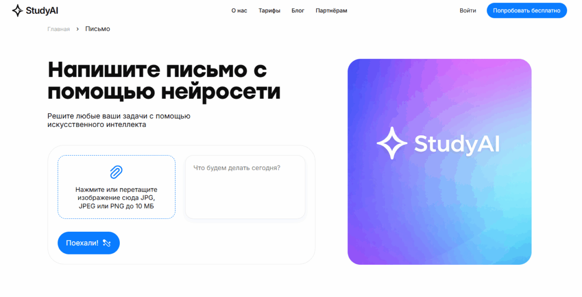 Study AI — помощник «одной кнопки»: специализированный раздел для генерации писем с минимальными настройками.