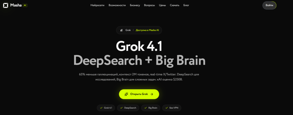 MashaGPT — мощный агрегатор: объединяет лучшие мировые модели (Grok, GPT-4) для создания сложных текстов в одном окне.