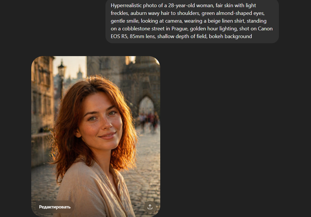 Пример сильного промпта: «Hyperrealistic photo of a 28-year-old woman, fair skin with light freckles, auburn wavy hair to shoulders, green almond-shaped eyes, gentle smile, looking at camera, wearing a beige linen shirt, standing on a cobblestone street in Prague, golden hour lighting, shot on Canon EOS R5, 85mm lens, shallow depth of field, bokeh background».