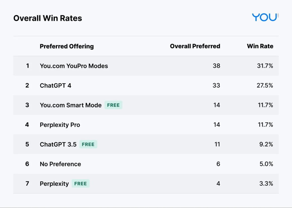 You.com не скупиться на похвалу себе. Как говорится на сайте платформы, Premium Agent You.com превзошли ChatGPT-4 и Perplexity Pro по общим предпочтениям пользователей. Премиум-агенты портала также набрали больше баллов по полноте, фактической точности и верности замыслу запроса. Бесплатный Smart Agent от You.com стал самой эффективной бесплатной моделью, превзойдя ChatGPT 3.5 и Perplexity по общим предпочтениям пользователя, а также по точности и ясности.