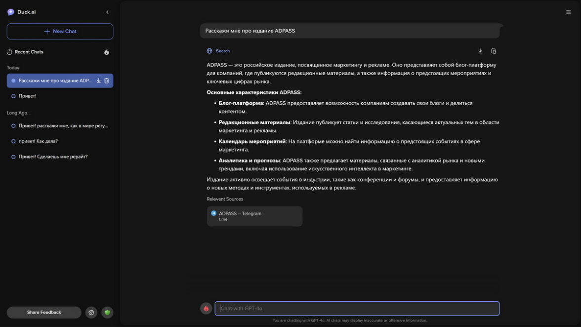 Прежде всего стоит понимать, что Duck.ai это ИИ-продолжение DuckDuckGo — поисковика с стажем, ориентированного на конфиденциальность. В ИИ-секции сервиса никому не будут рисовать графики, диаграммы и делать выводы на основании научных исследований. Но с задачей суммирования информации из интернета и выдачи нужных ссылок Duck.ai справляется хорошо. И все это даже без намека на рекламу.