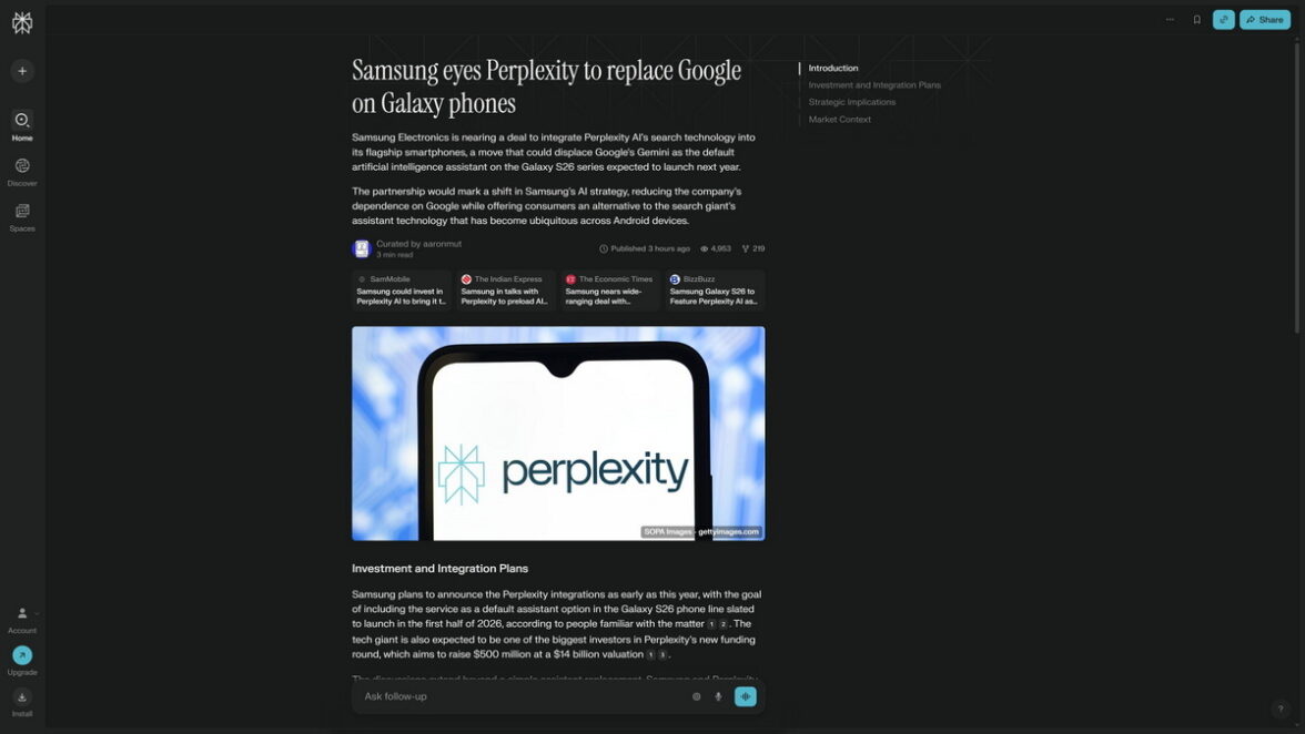Успехи и технологии Perplexity заинтересовали компанию Samsung. Как сообщило 2 июня 2025 года агентство Bloomberg, компания Samsung Electronics близка к заключению масштабной сделки по инвестированию в Perplexity AI. По словам источников агентства, обе компании ведут переговоры о предустановке приложения и ИИ-ассистента Perplexity на будущих устройствах Samsung (возможно, это будет Galaxy S26) и интеграции функций поиска стартапа в веб-браузер Samsung. Похоже, что Google, который, вечно, властвовал в поиске на телефонах Samsung, есть о чем побеспокоиться.