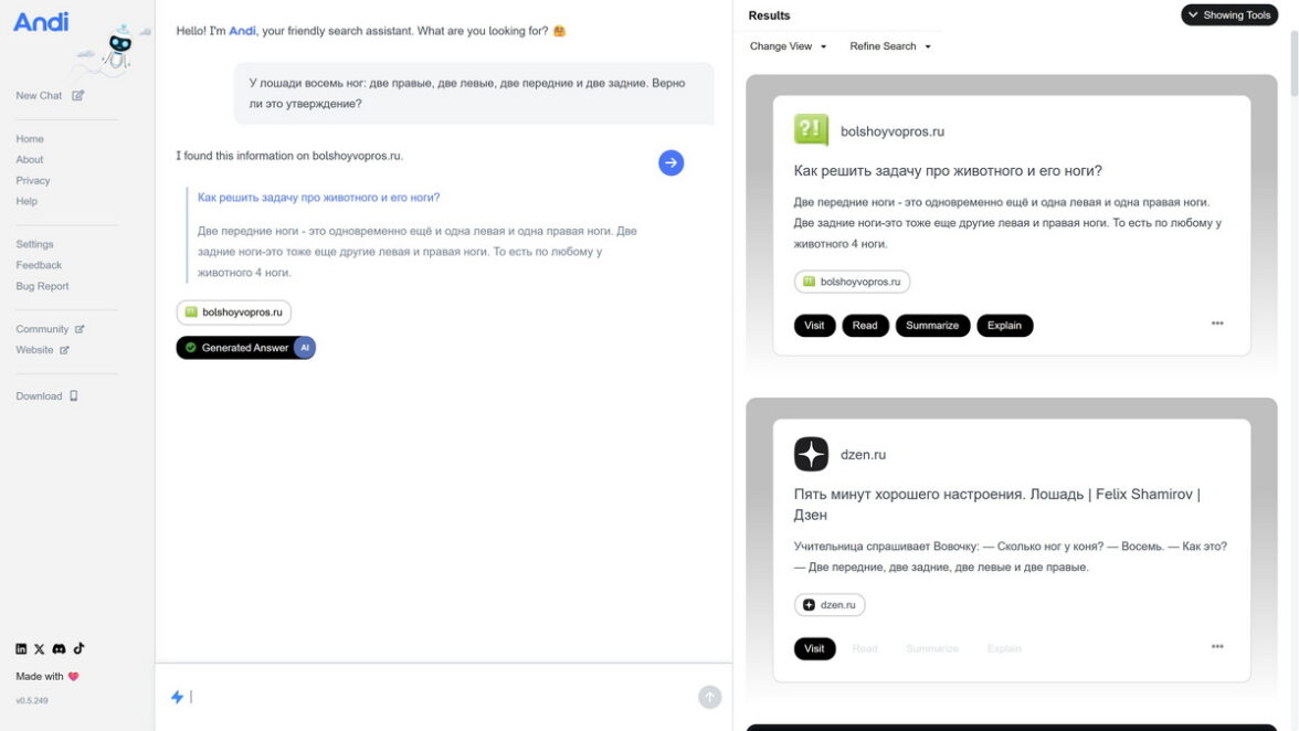 Единственное, чем приятно удивляет Andi — это теплым ретро-интерфейсом. Такое впечатление, что его рисовали лет 25 назад. Экран поделен на три горизонтальные части: колонка настроек, колонка ответов и колонка с предпросмотрами сайтов, который поисковик считает релевантными. Это удобно. На этом плюсы Andi заканчиваются. Работа ИИ-чат-бота вызывает много вопросов. Помимо самопроизвольного перевода на английский ответов, заданных на русском, поисковый чат-бот не может поддержать беседу. Это очень странно. В отличие от своих готовых поболтать ИИ-коллег, отвечающих на вопрос «Как дела?» фразой вроде «У меня все неплохо, а как у тебя?», Andi на это же вопрос предложил 12 вариантов, как сказать «Как дела?» на русском языке. Похоже, что Andi слишком увлечен поиском.