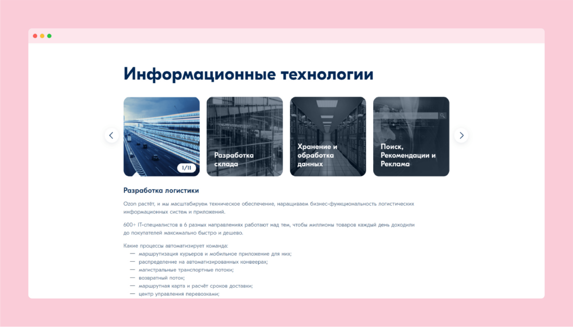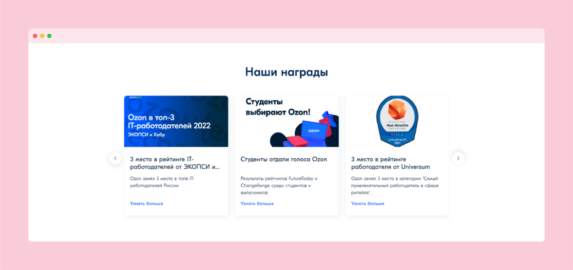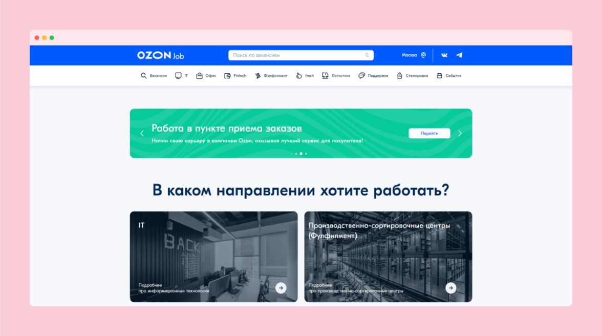 Основная фишка карьерного сайта Ozon Job — простота и понятность. Весь контент логично структурирован, нет ничего лишнего, всё разложено по полочкам. Ну, кроме баннера на главном — наше внимание его всеми способами и правдами избегло.