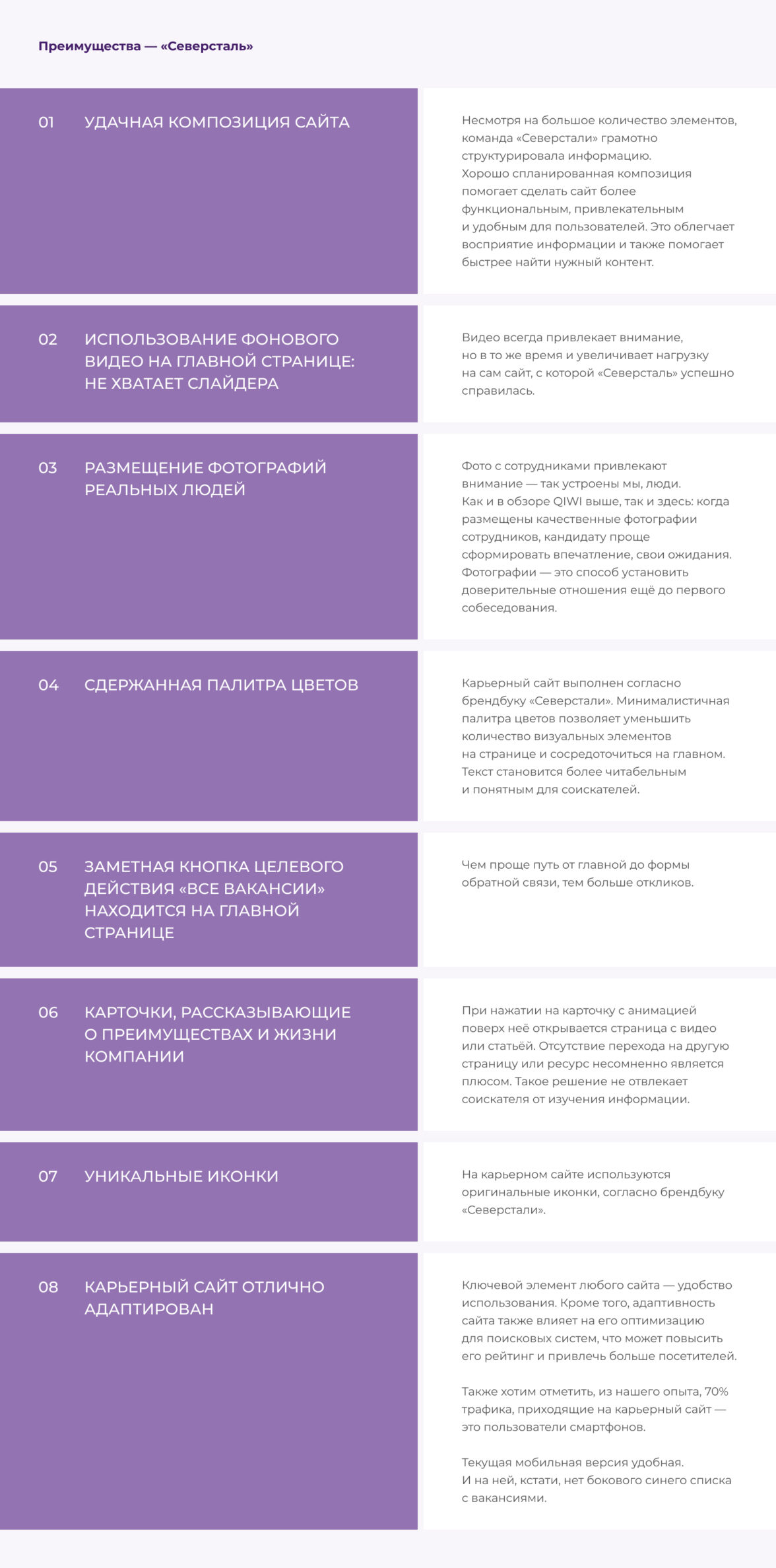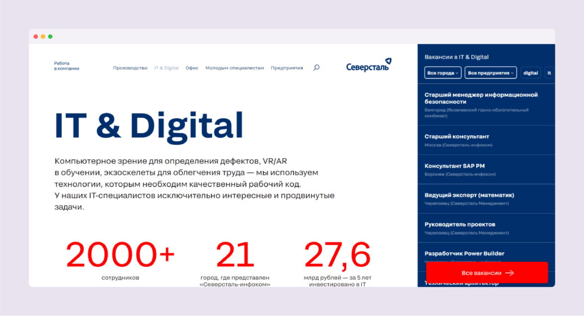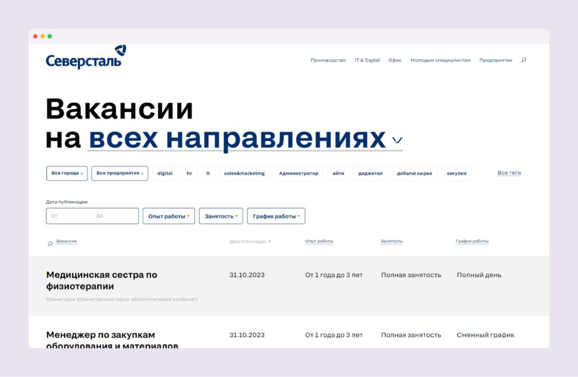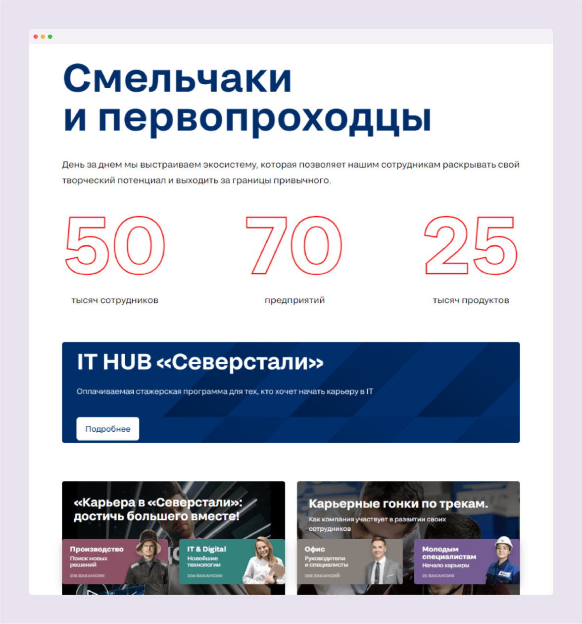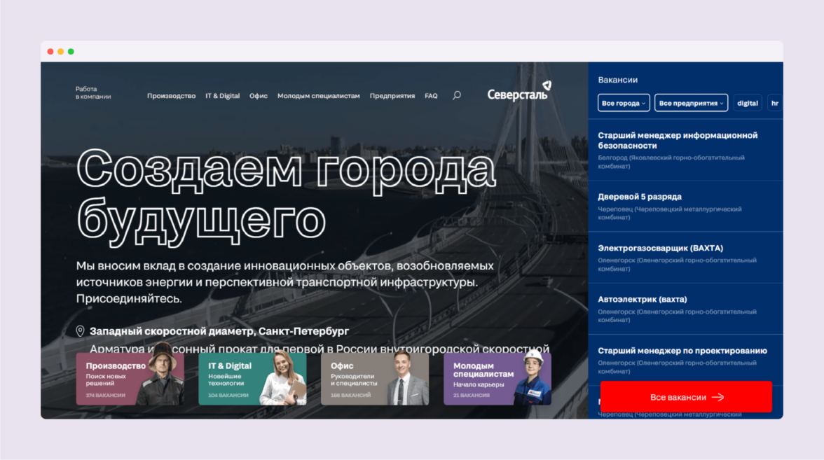 Нам приглянулся портал «Северстали» из-за его объёма. Несмотря на количество страниц и разделов на сайте, он достаточно SEO-оптимизированный. Также на этом карьерном сайте настроены все счётчики аналитики, что позволяет HR-специалистам оценивать эффективность работы инструмента со всех сторон.