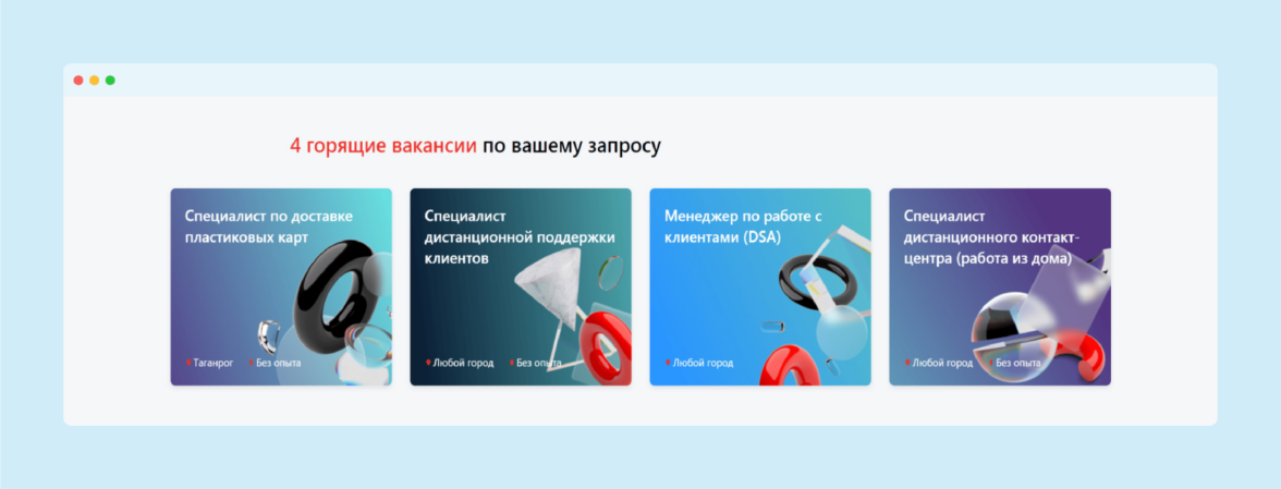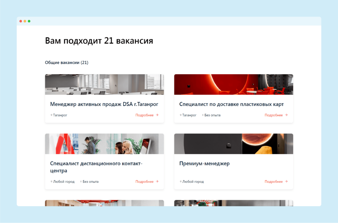 Список с вакансиями состоит из иллюстрации в стилистике бренда Альфа-Банка, названия, параметров-тегов и целевой кнопки «Подробнее».