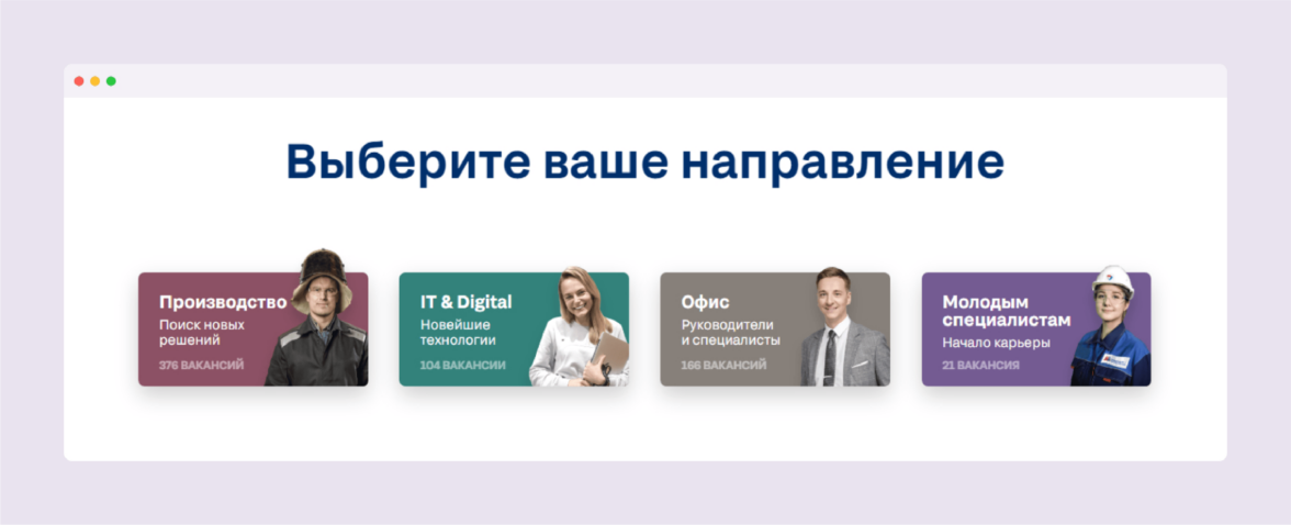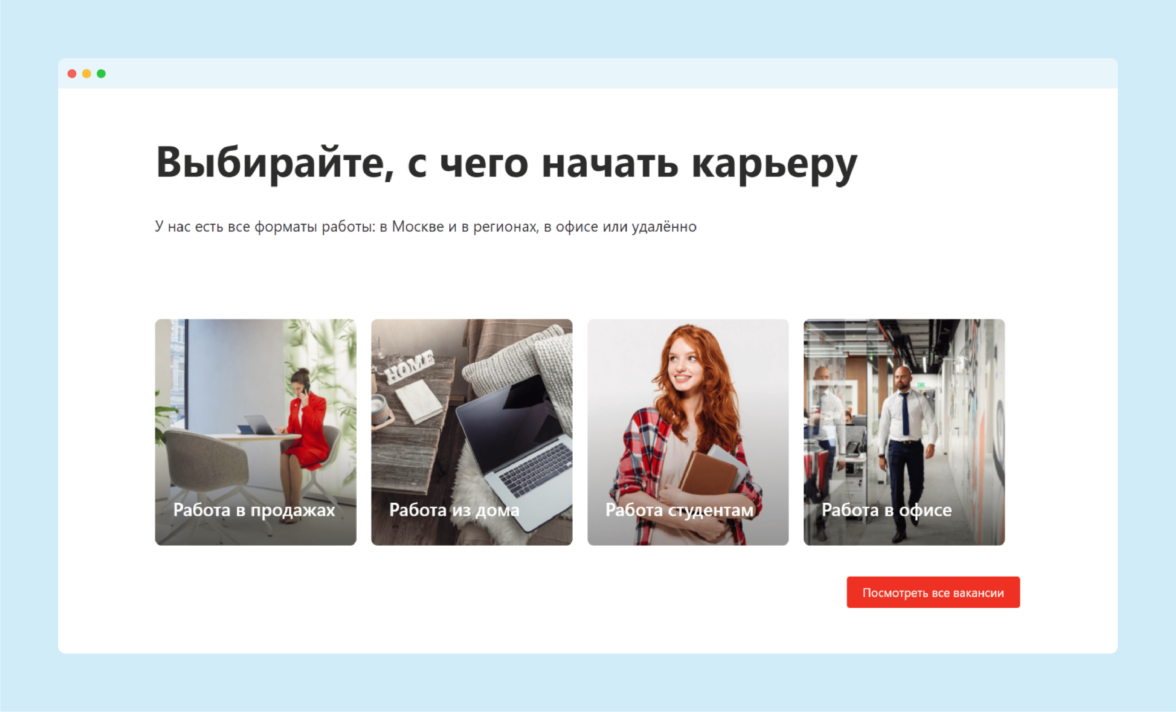 Направления работы с призывающим к действию заголовком. Работодатель приглашает выбрать формат работы — удалённый, в офисе или ознакомиться с вакансиями для студентов. При нажатии происходит преднастройка фильтра для более точного поиска интересующей позиции.