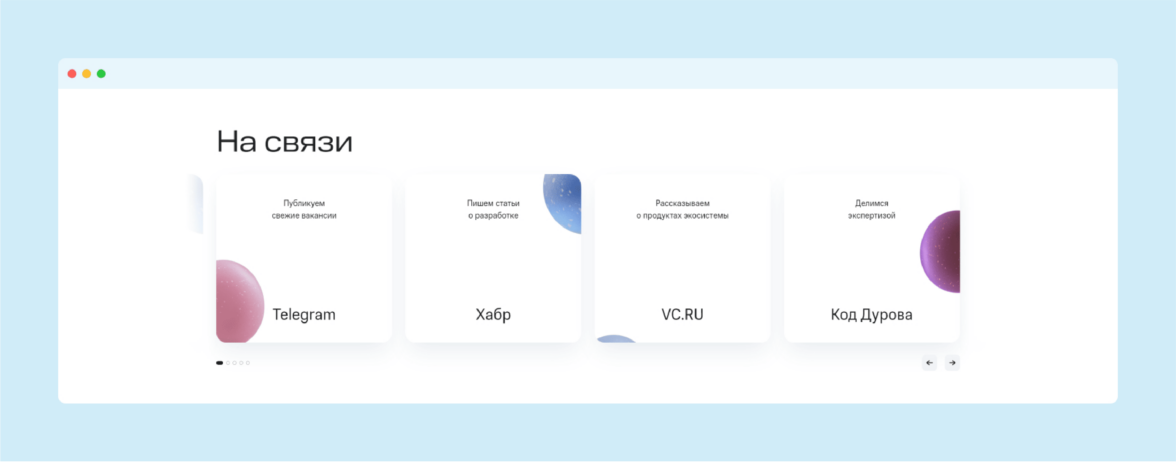 Ещё один интересный момент, который мы не смогли пропустить. В отличие от описанных карьерных сайтов выше МТС в своём собрала все ресурсы компании в одном месте. Разместила ссылки на социальные сети, журналы, блоги — свежие вакансии, истории, статьи и кейсы в виде слайдера.