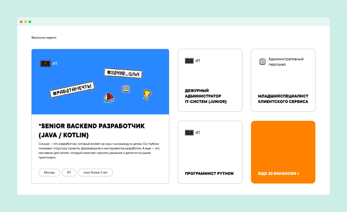 Идея создать сначала новую концепцию бренда работодателя, айдентику, только потом — сам карьерный сайт, вызвала у нас отклик. Именно поэтому мы решили заострить внимание на карьерном сайте QIWI.