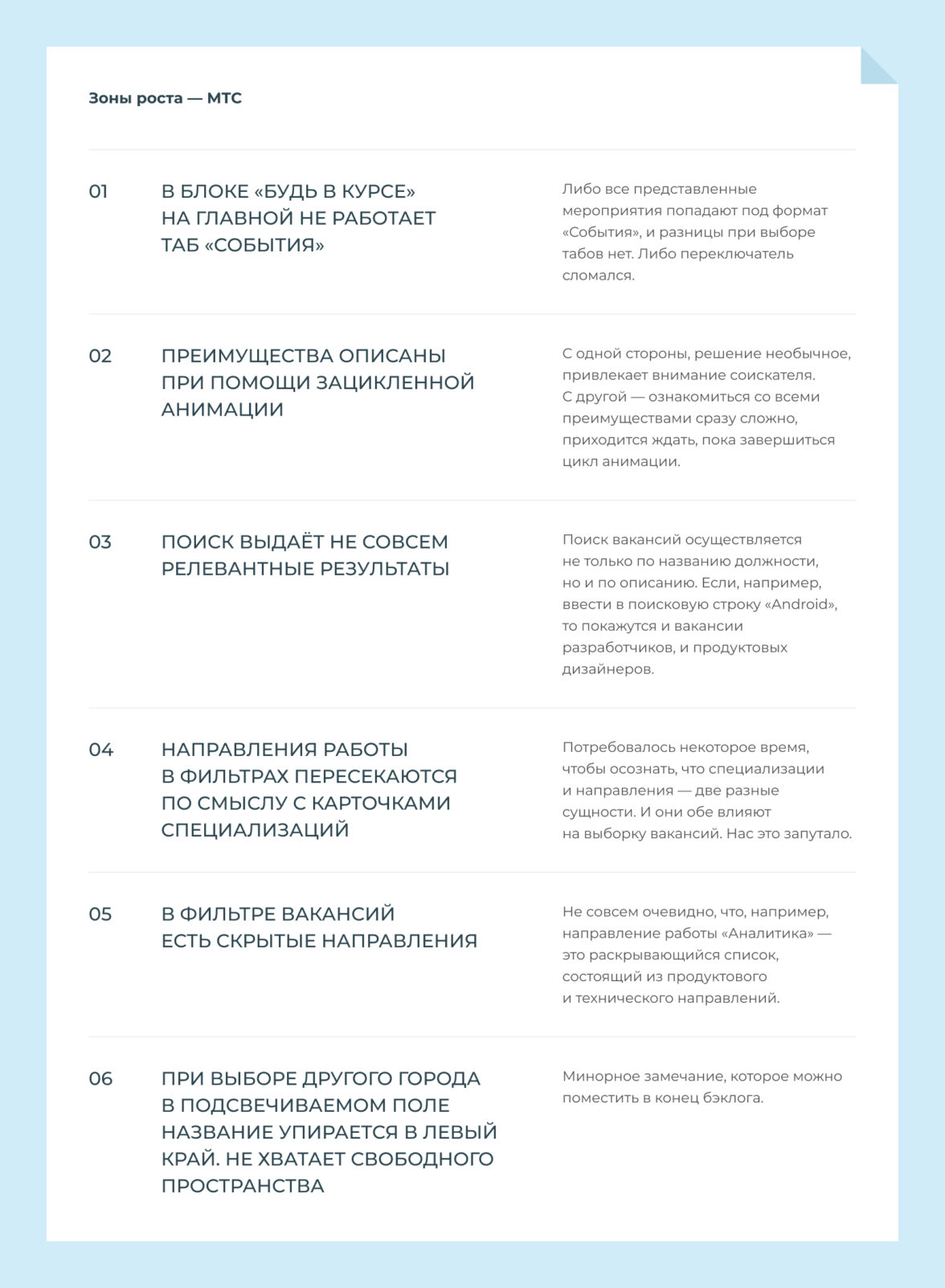 С точки зрения дизайна было трудно найти недочёты. Основные замечания затрагивают больше технические моменты, которые легко можно поправить. А визуальная составляющая карьерного сайта МТС, путь кандидата от первого касания до отклика — прекрасны. Мы получили удовольствие от этого обзора.