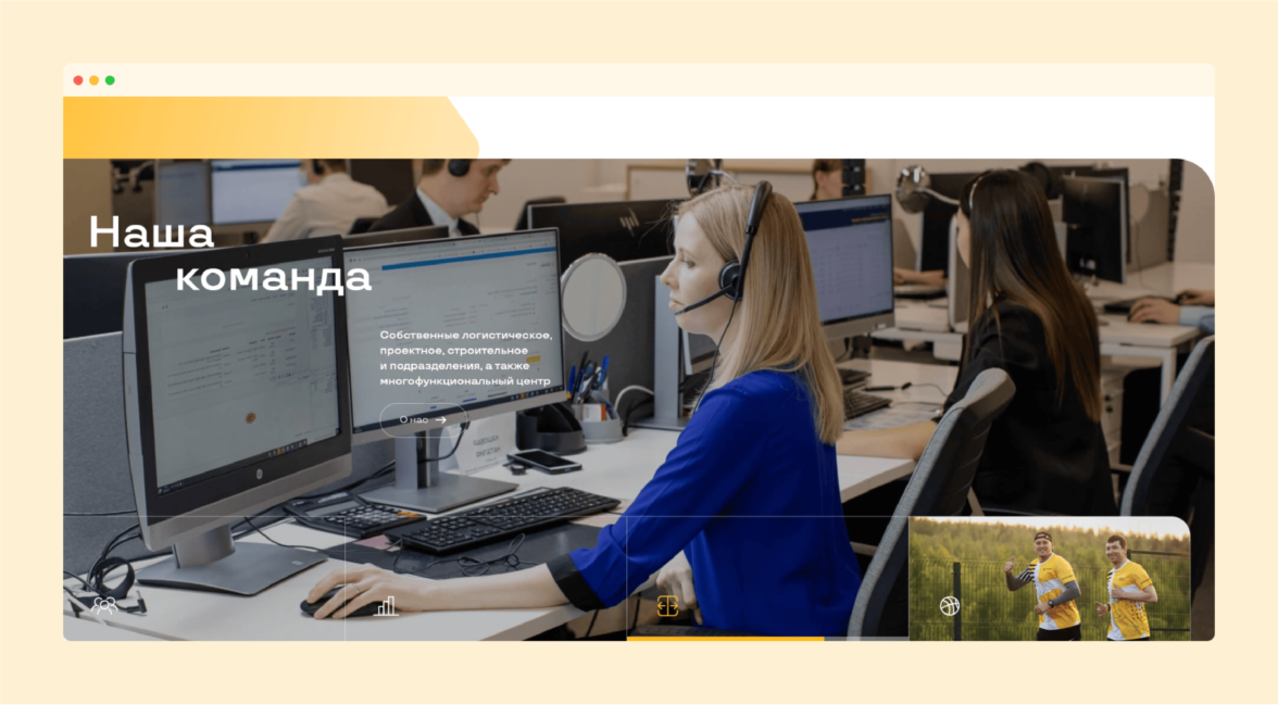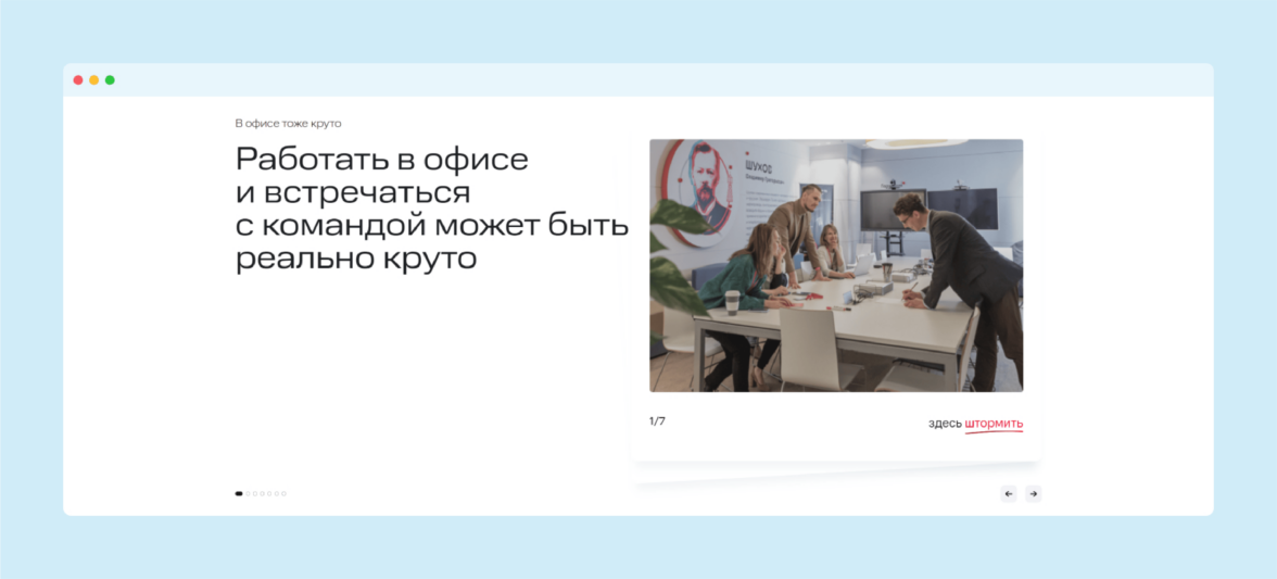 Далее бренд работодателя при помощи слайдера с фотографиями погружает кандидатов в рабочую офисную обстановку. Наглядно показывает при помощи фото опенспейсов и сотрудников, как выглядит жизнь в офисе. Что это не только «nonstop hard work», но и плотное взаимодействие с командой — мозговые штурмы, переговоры, small-talk-беседы за вкусным кофе, отдых и совместные фоточки.