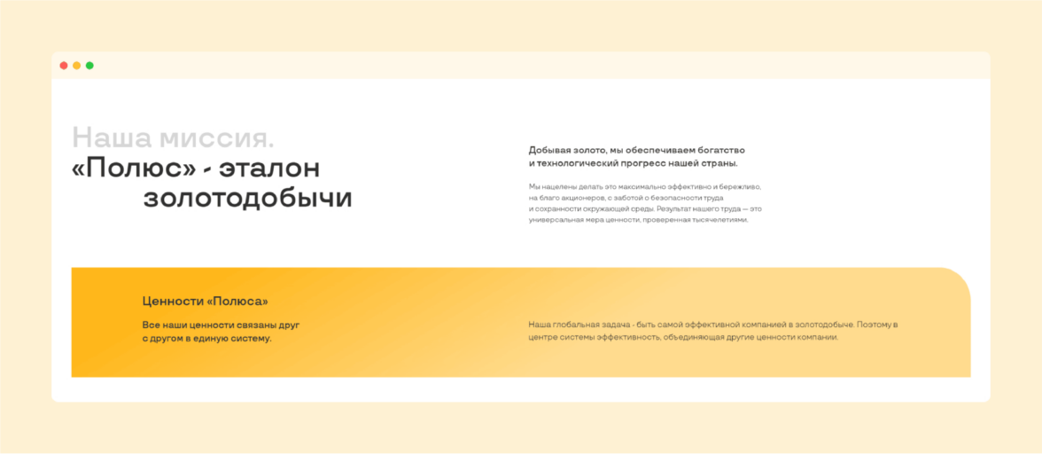 В следующем блоке раскрывается бренд работодателя. Команда «Полюса» при помощи пяти фраз характеризует себя как лидера в золотодобыче. Крупнейшего производителя золота в мире, который заботится об экологии и своих сотрудниках.