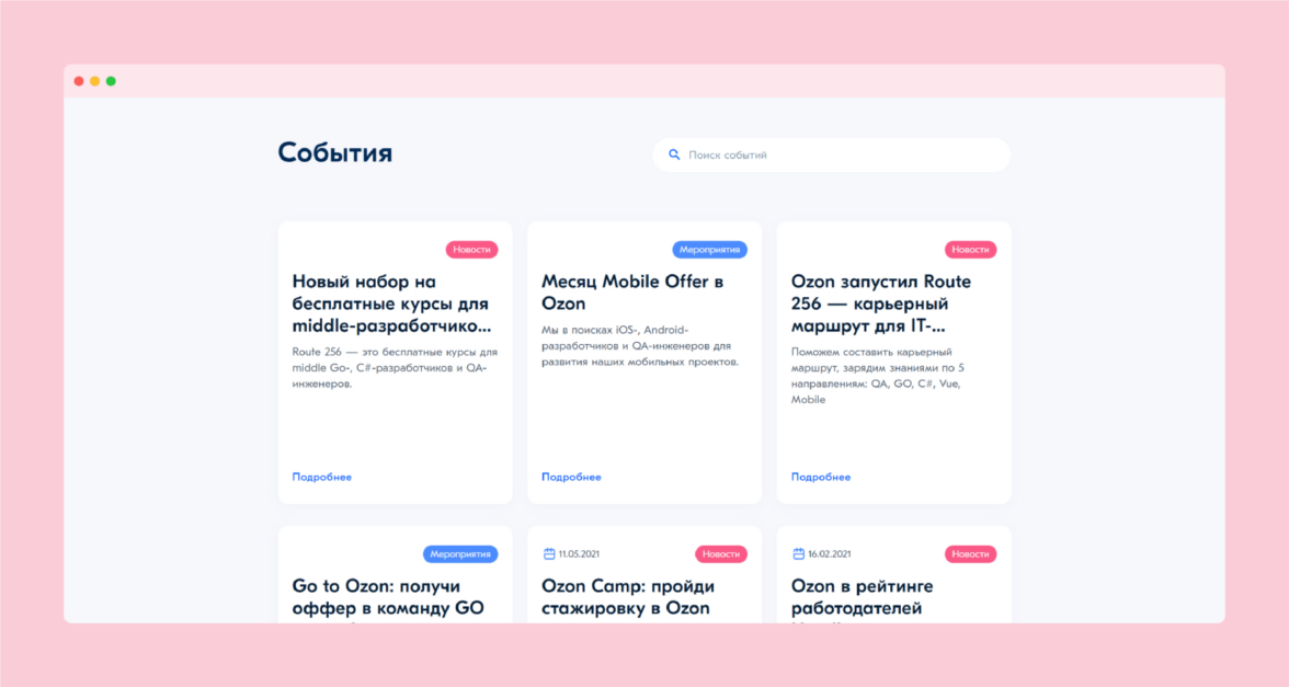 Страница событий. Интересный ход и, вероятно, эффективный — разместить на карьерном сайте раздел, посвящённый мероприятиям. Мы считаем, что для соискателей любое событие, которое проводит Ozon, — это дополнительная точка соприкосновения с брендом работодателя. Это возможность поближе познакомиться с экспертами, HR-менеджерами, также шанс заявить о себе.