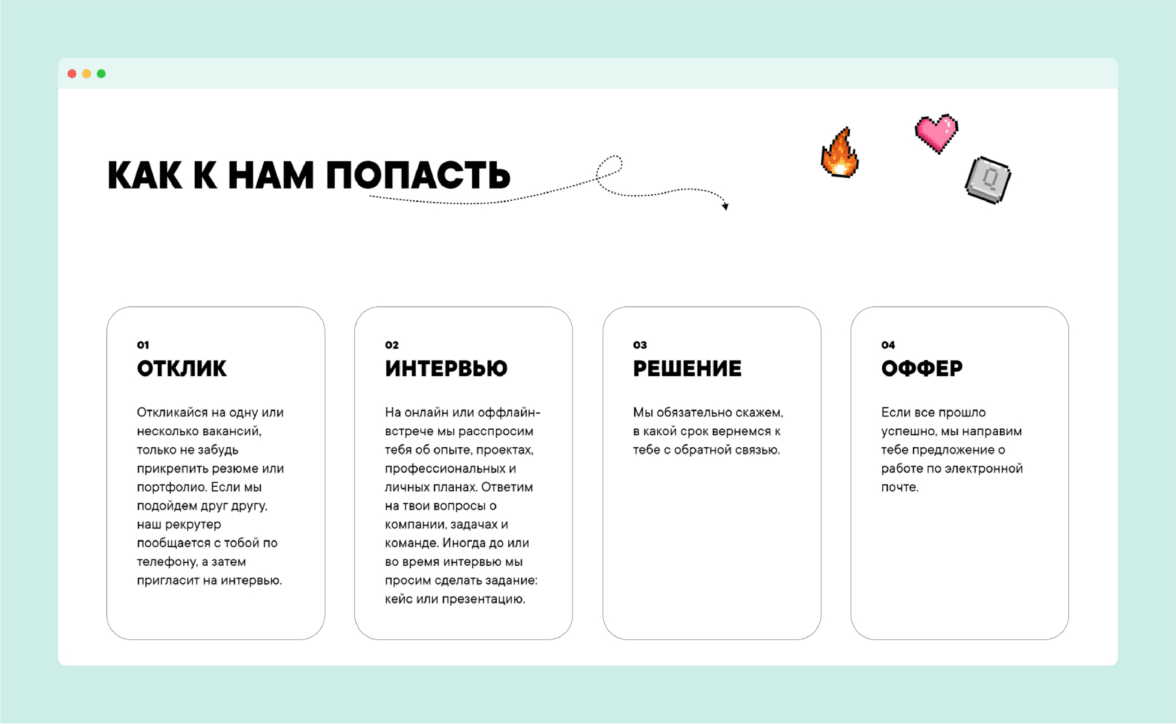 Проработанный блок FAQ позволяет закрыть основные ответы на вопросы кандидатов. Плюс для SEO — в блок FAQ можно включить основные запросы из семантического ядра. Это позволит повысить позиции в поисковой выдаче и увеличить количество посетителей сайта.