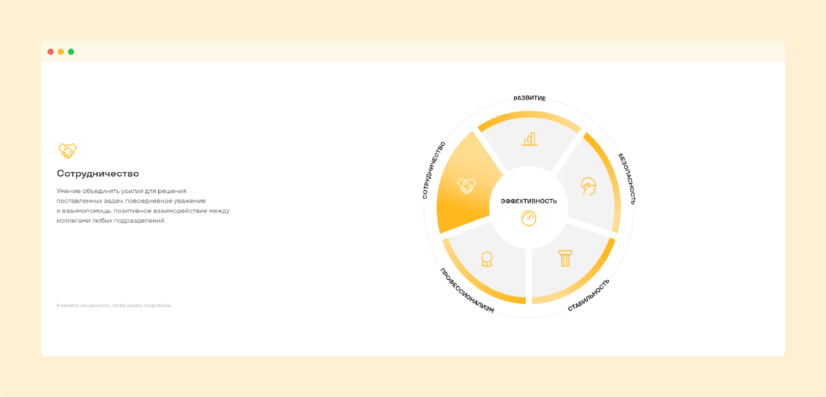 При помощи интерактивной диаграммы HR-команда знакомит кандидатов с пятью ценностями «Полюс» — это развитие, безопасность, стабильность, профессионализм, сотрудничество.
