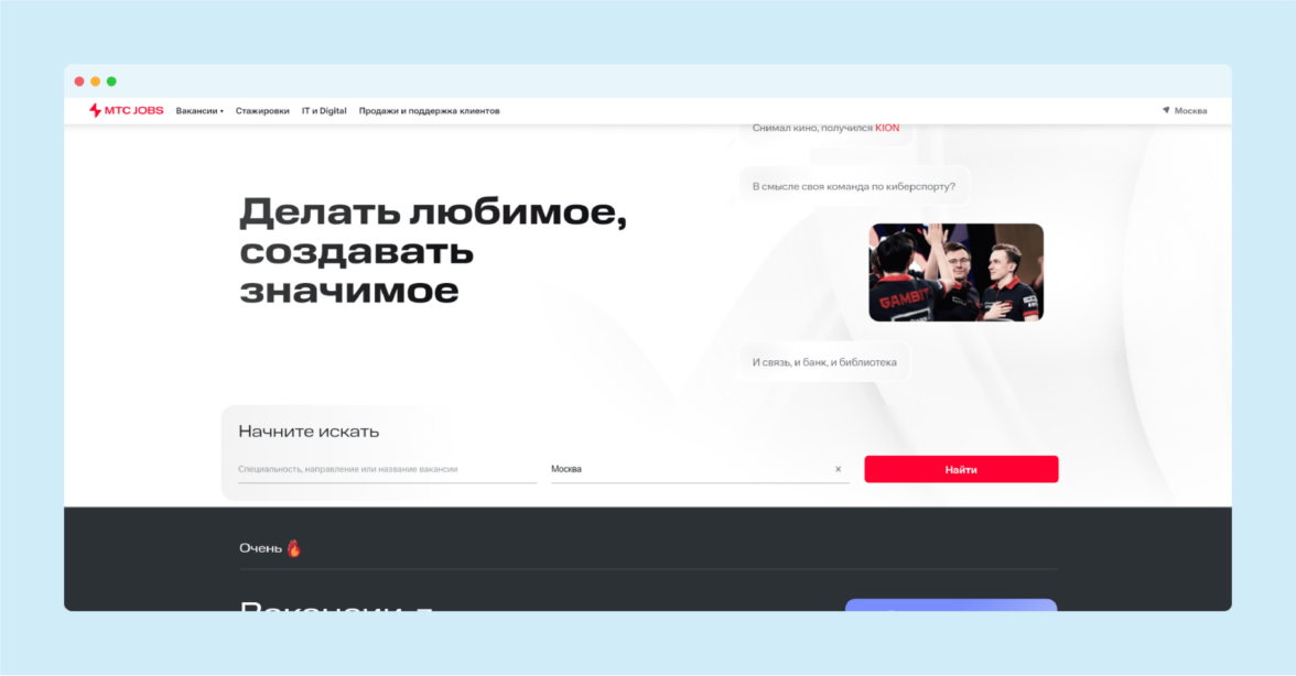 «Делать любимое, создавать значимое» — это не только про процесс написания этой статьи) Это и основной месседж, главный заголовок карьерного сайта МТС, заключительного HR-инструмента в нашем топе.
