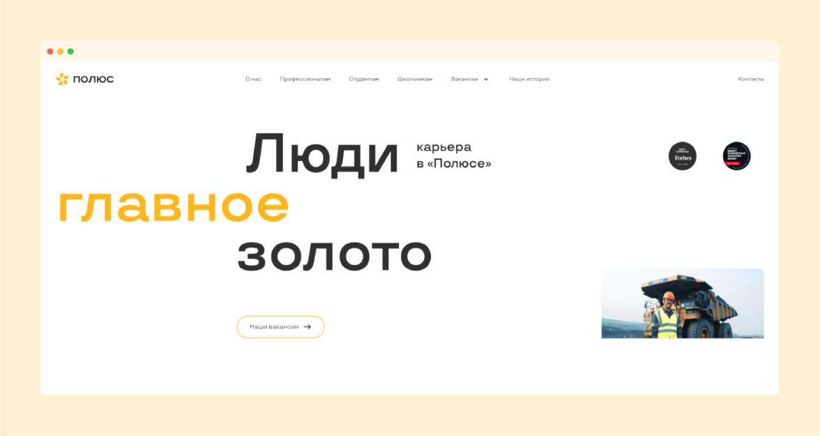 Главная страница. Первый экран встречает соискателя крайне прямым, но точным месседжем: «Люди — главное золото». С первых секунд пребывания на сайте работодатель открыто заявляет, что сотрудники «Полюса» ценятся выше золота любой пробы. И эти слова ненавязчиво подтверждаются при помощи двух наград от Forbes и Best Company Awards.