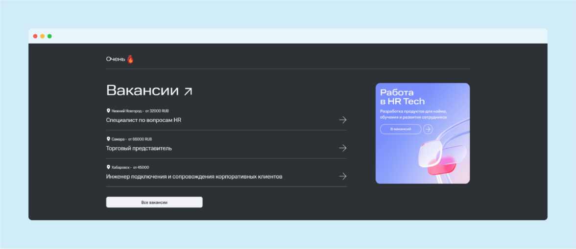Страница со всем вакансиями. Этот раздел управляет вниманием пользователя — плавно ведёт соискателя по странице: