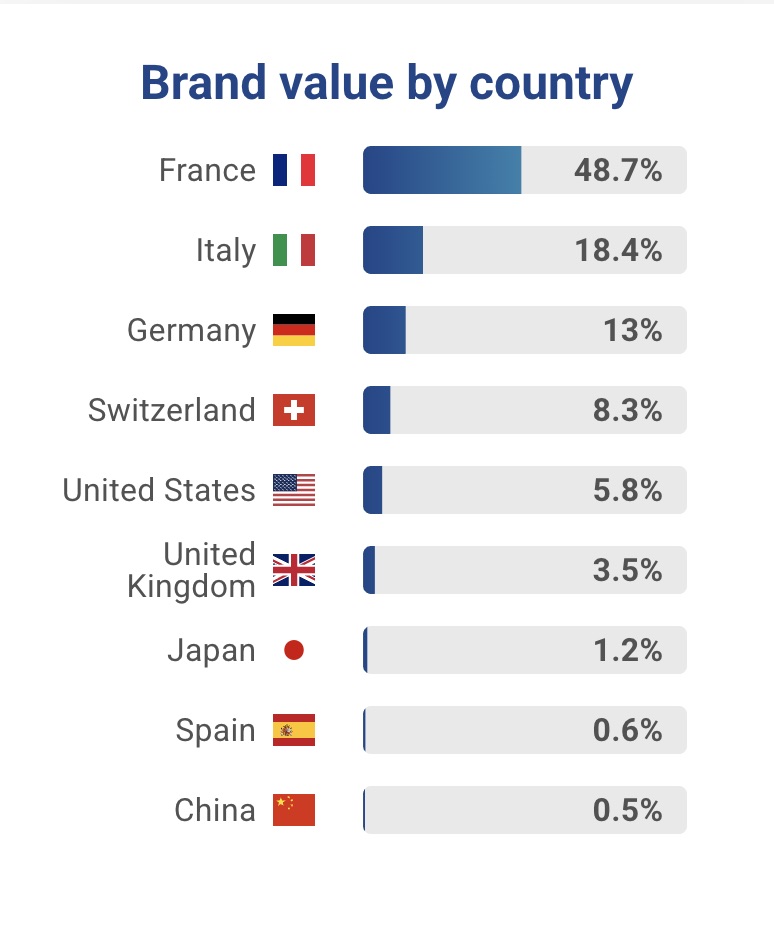 Франция — законодатель luxury-моды. Почти половина (48,7%) стоимости 50 самых дорогих люксовых и премиальных брендов, включенных в рейтинг, приходится на бренды 15 французских компаний. Второе место у Италии. Она также представлена 15 компаниями, но их доля в общей стоимости 50 брендов — 18,4%. Немецкая компания в рейтинге всего одна, но какая… Оценка Porsche составляет 13% от общей стоимости всех 50 фигурантов рейтинга. Швейцария представлена шестью компаниями, Великобритания — 5, США — 4, Япония — 2. Кроме Германии по одной компании попали в рейтинг от Китая (Shangri-La) и Испании (Loewe).