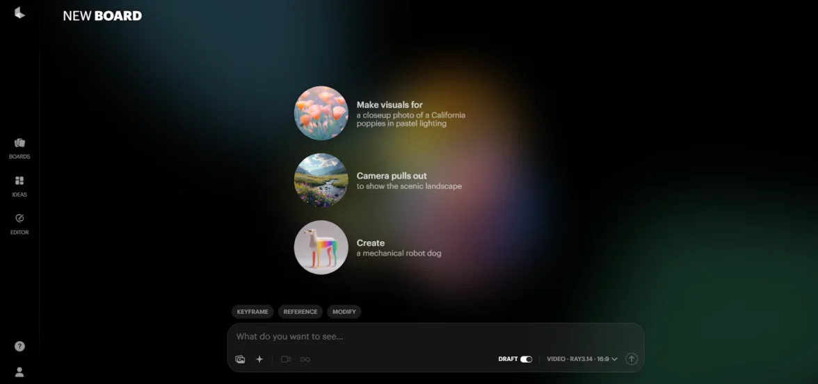 Luma — мощная нейросеть для генерации фотореалистичных коротких видеороликов. Создает пятисекундные видео по изображению или тексту и поддерживает работу с ключевыми кадрами.