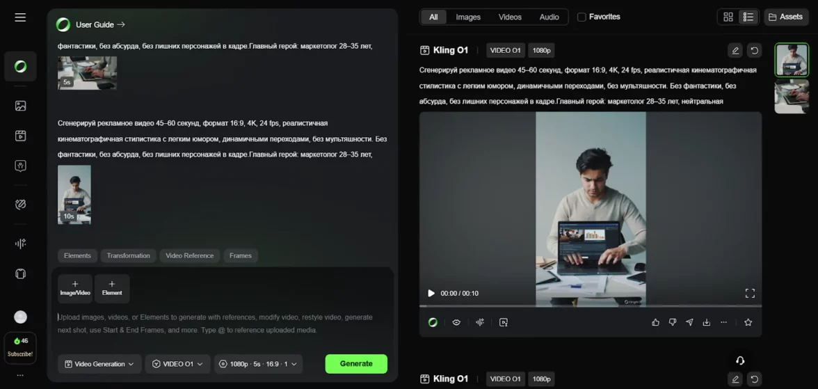 генерация роликов длительностью до 2 минут в разрешении 1080p;