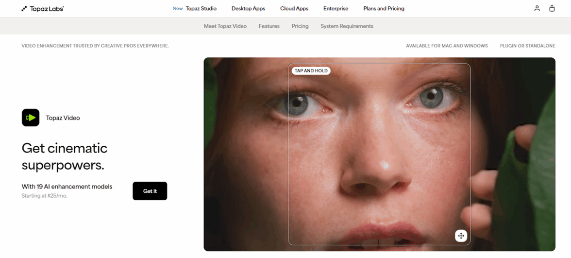 Topaz Video AI — профессиональное десктопное решение для улучшения и восстановления видео. Сервис не просто увеличивает изображение, а восстанавливает детали с помощью специализированных моделей.