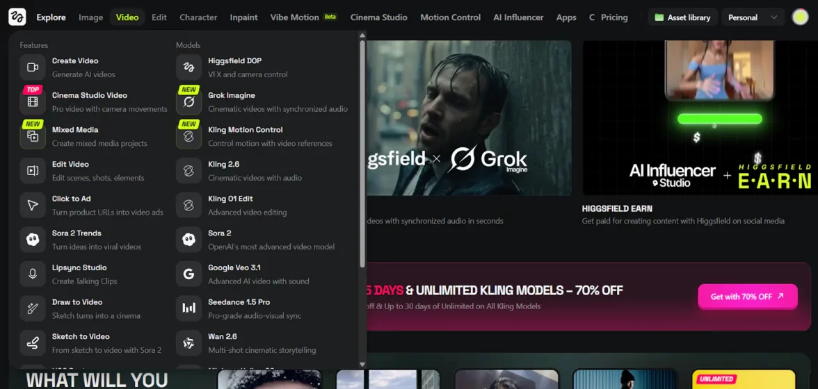 генерация на моделях Sora 2, Minimax 2.3, Google Veo 3.1 и собственных моделях Higgsfield;