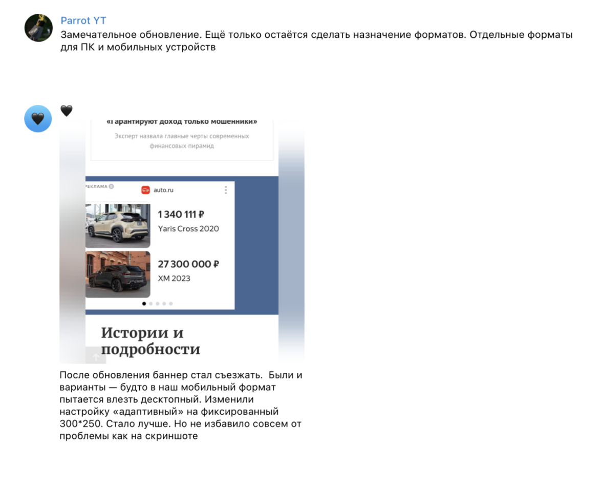 Новость была воспринята положительно в телеграм-канале «Рекламная сеть Яндекса», а также сразу появилась первая обратная связь по использованию форматов: