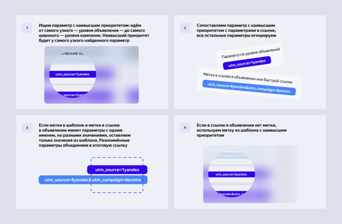При заполнении блока «Параметры URL», например сразу на уровне групп и кампаний, итоговая метка будет формироваться по определённым правилам: