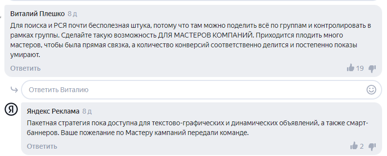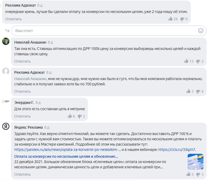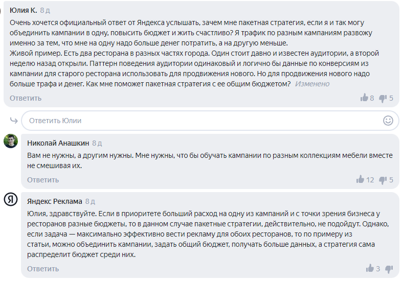 Яндекс, в основном, старается прислушиваться к мнениям специалистов, так что вполне возможно наши комментарии повлияют на будущее Директа. В комментарии к этой рубрике специалисты Яндекса иногда заходят и отвечают на вопросы.