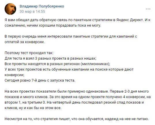 Самое ожидаемое и дискуссионное обновление. Напомним, что Яндекс отключает ручное управление в РСЯ, и предполагалось, что пакетные стратегии помогут удержать эффективность.