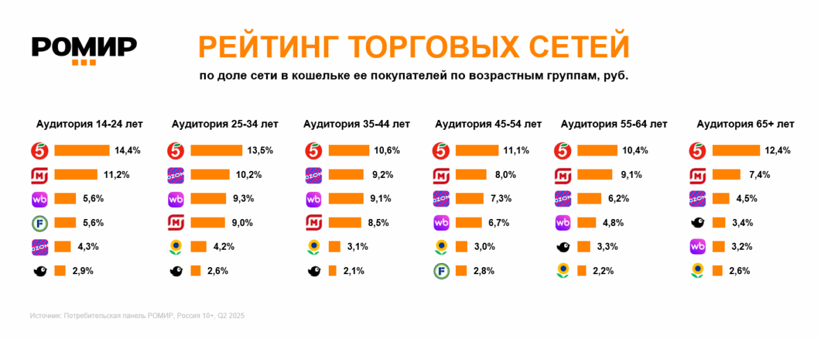 Первую строчку рейтинга занимает «Пятёрочка» вне зависимости от возраста покупателя, на втором месте у молодежи до 24 лет и у категорий 45–54 и 65+ «Магнит у дома», а у 25–44-летних — Ozon.ru, третье место делят Ozon.ru и Wildberries.ru.