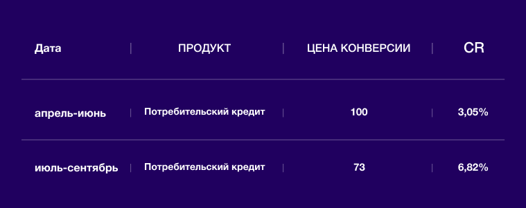 Из таблицы 3 видно: по потребительскому кредиту тоже получили позитивные результаты. Цена конверсий снизилась на 27%, CR вырос с 3,05% до 6,82%.