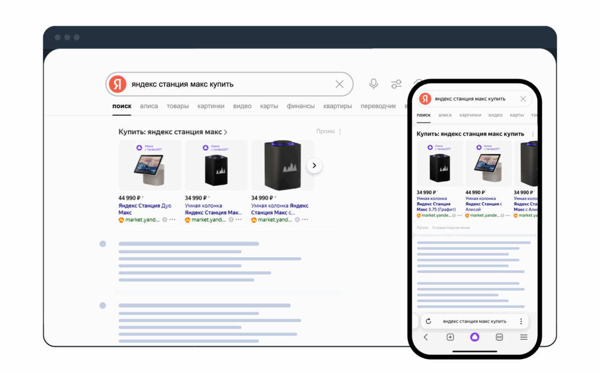 Товарные объявления формируются на основе ассортимента сайта или специального файла — товарного фида. Они показываются: