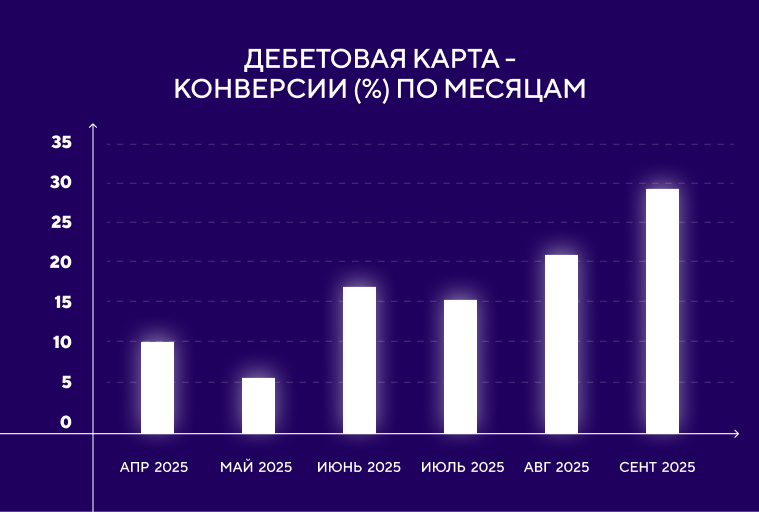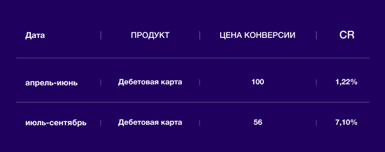 По дебетовой карте (таблица 2) получили такие данные: цену конверсий снизили на 44%, CR вырос с 1,22% до 7,10%. Число конверсии увеличилось на 69% при сопоставимом бюджете.