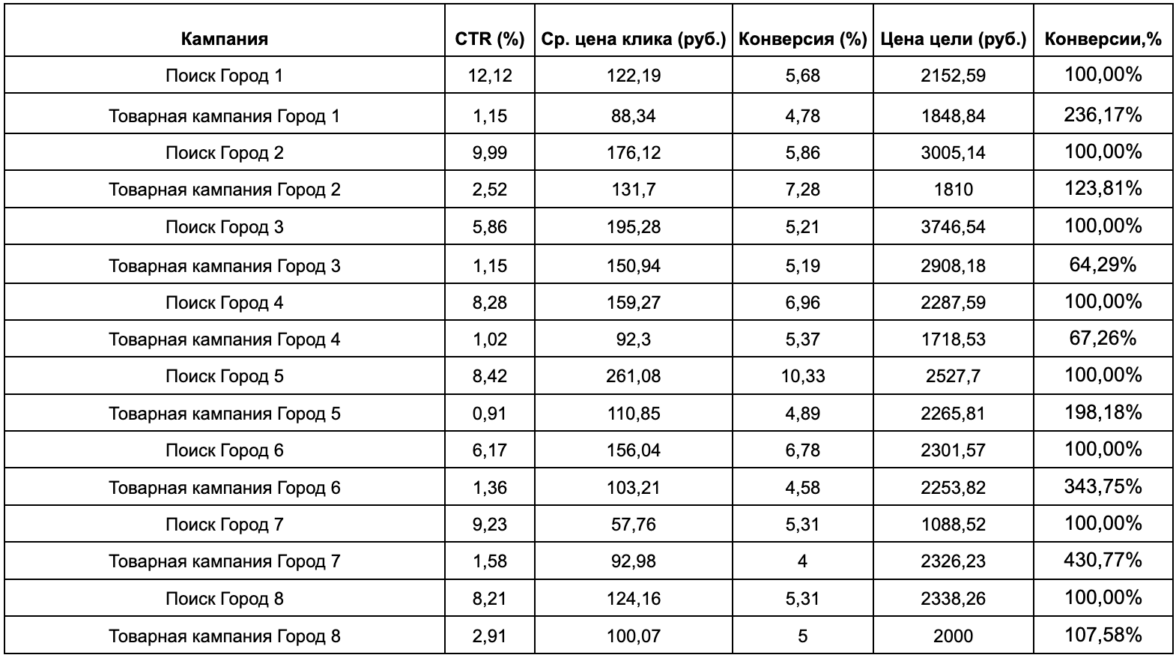 Когда в кейсах показывают хорошие результаты по стоимости, но не говорят про объем, складывается вполне резонный вопрос:, а не получилось ли так за счет точечного выкупа самого дешевого трафика на низких оборотах? Масштабируем ли результат, или при возрастании объемов экспериментальная кампания покажет те же, а, возможно, и более плохие результаты? Здесь для чистоты статистики введен столбец с нормированным количеством конверсий, и мы можем увидеть, что более низкая стоимость конверсий в товарных кампаниях получена на объеме конверсий не менее чем 50% от объема поисковых, а для многих городов поток конверсий с товарных кампаний превзошел поиск.