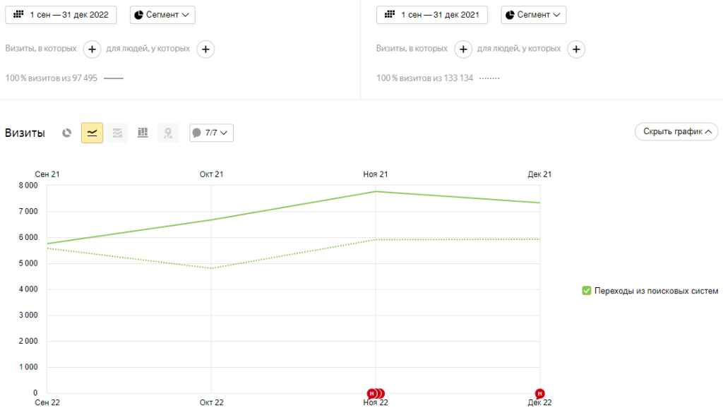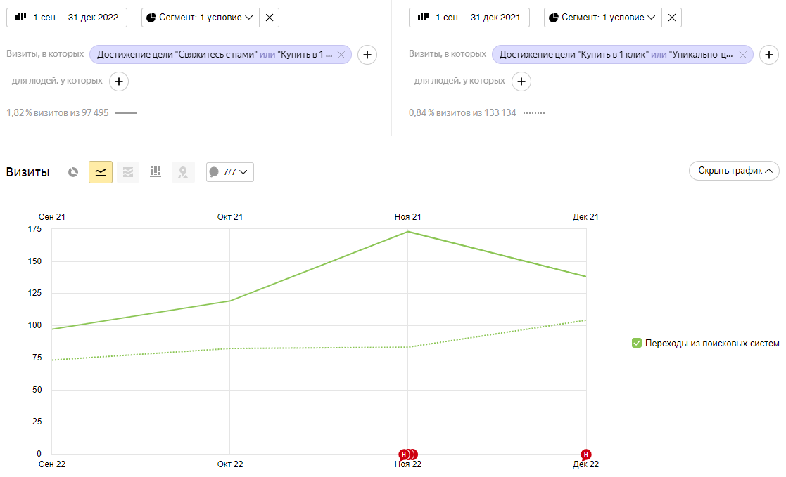 объем трафика на сайт за последний квартал 2022 года (октябрь, ноябрь, декабрь) вырос на 30% относительно последнего квартала 2021 года;