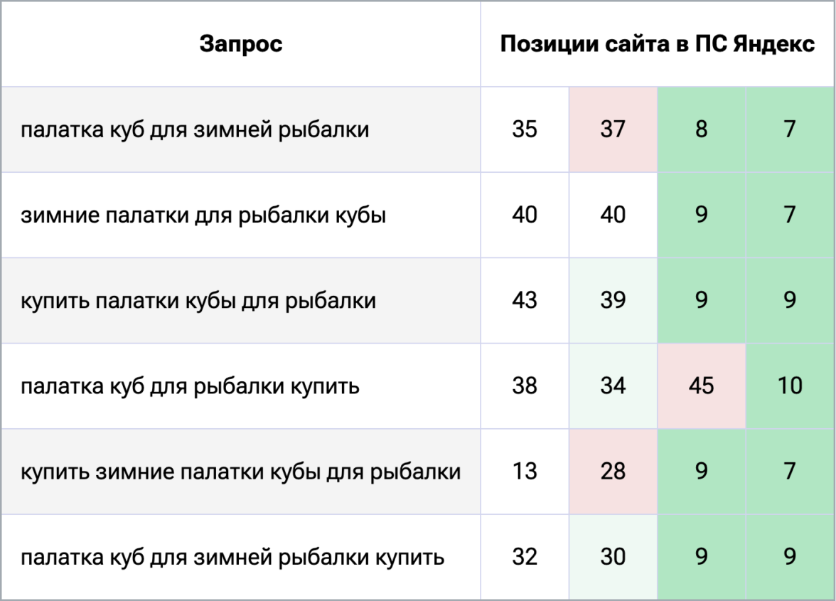 После каждой доработки позиции сайта по отдельным кластерам росли, например, несколько кластеров в зимних палатках для рыбалки: