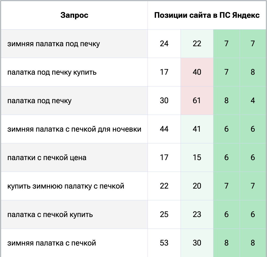 Позиции сайта по кластеру «Палатки с печкой» до и после проработки раздела