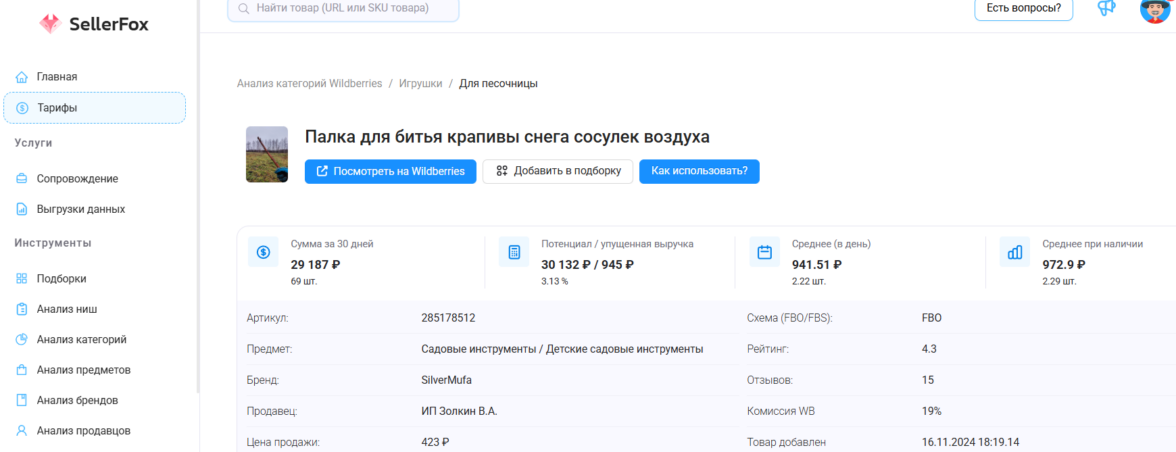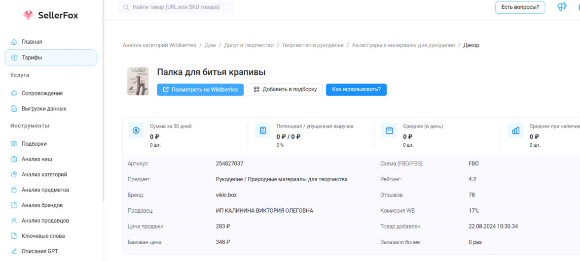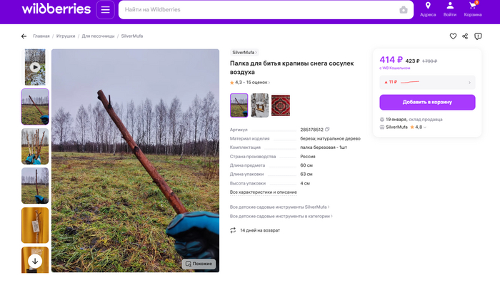 А вот его предшественник — селлер, который еще с августа 2024 года начал продавать на Wildberries палки для битья крапивы, судя по всему, решил снять товар с продажи. Не уж то не пошло?