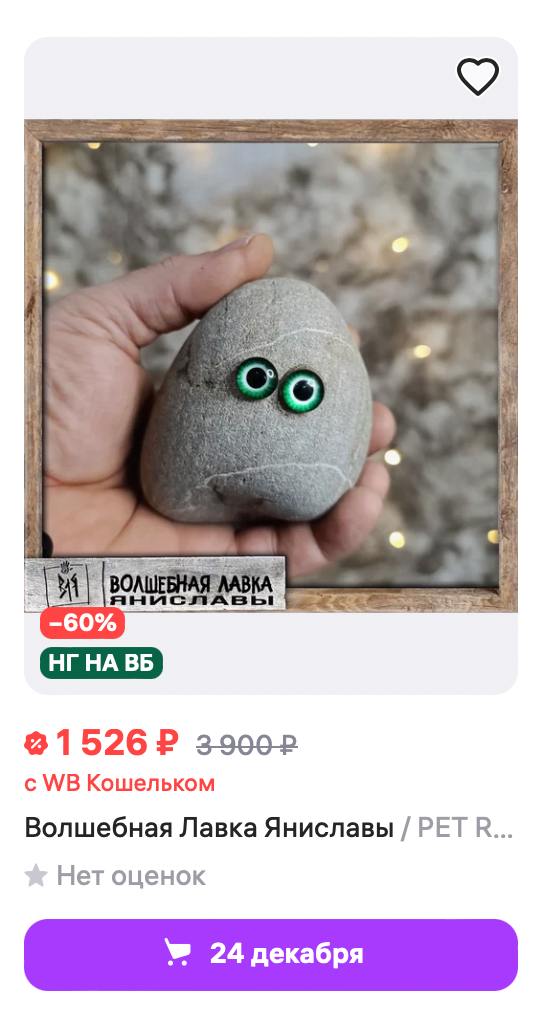 Предприимчивый селлер приклеил на камень декоративные глаза, упаковал в красивую коробку и приложил инструкцию по уходу. Мол, камень-питомец подходит тем, кто не любит животных или есть аллергия на собак или кошек. Самые продвинутые камни продавались с гнездышком, одеждой и кормом на первое время.В канун Нового года товар продавали на Wildberries почти за 1500 рублей. Сейчас камней с глазами на фиолетовом маркетплейсе уже нет. Не уж то раскупили?