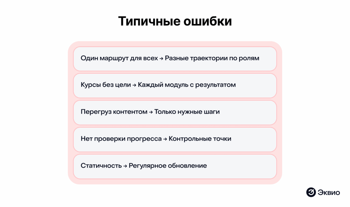 Любая траектория обучения может дать сбой, если при её проектировании упустить базовые принципы. Ошибки здесь стоят дорого: сотрудники теряют интерес, а бизнес — ожидаемый результат.