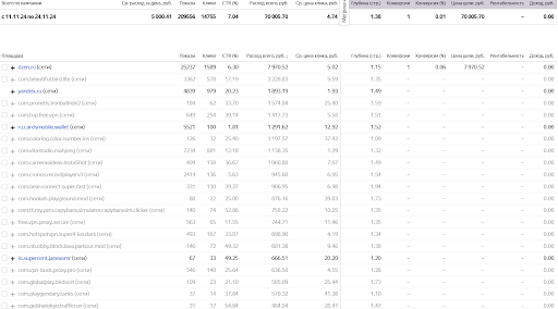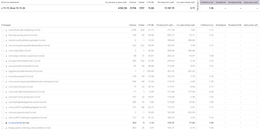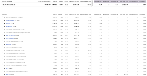 На первый взгляд кажется, что старт совершенно невнятный, но мы должны помнить, что кампании нужно время, чтобы обучиться. Те самые 2 недели после старта и после регулярной чистки площадок, картина становится совсем другой. Основной расход и трафик приходит с качественных площадок.