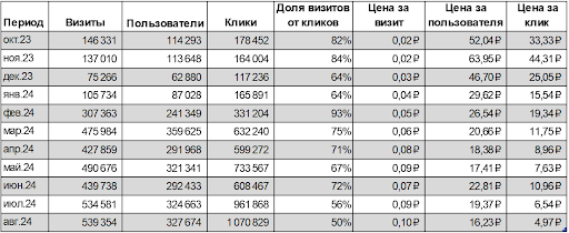 Однако, производимых действий явно недостаточно. Пример одного из клиентов, как менялось отношение визитов к кликам, которое уже составляет менее 40%