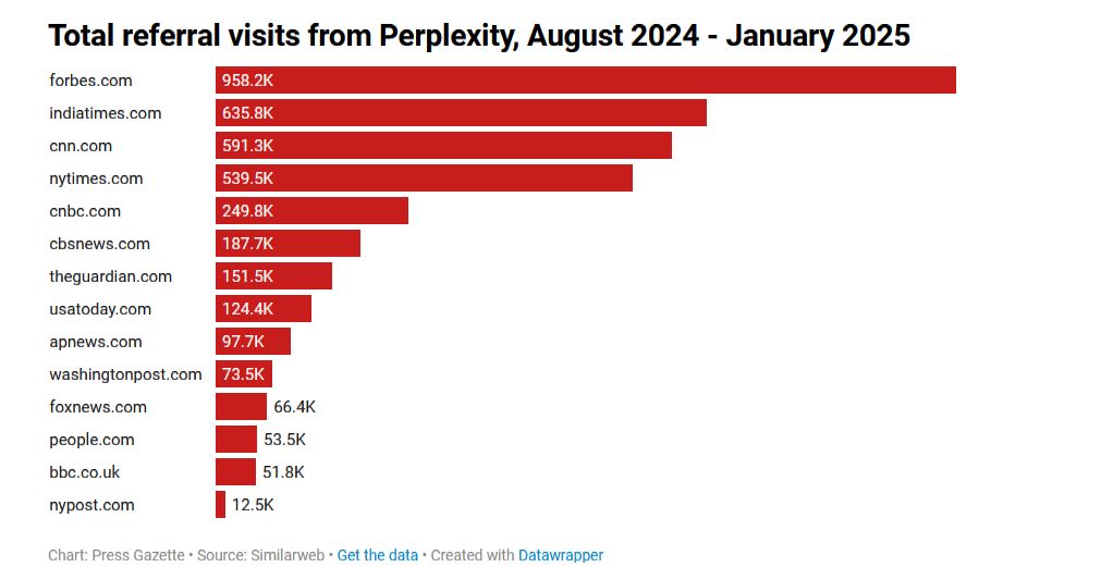 За шесть месяцев наибольший трафик рефералов на Perplexity среди 14 проанализированных сайтов получили Forbes (958 тыс. посещений), India Times (636 тыс.) и CNN (591 тыс.).